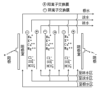 將溶液置于直流電場(chǎng)中,它所含的帶電離子就向帶相反電荷的電極移動(dòng)。如果在溶液中裝設(shè)離子交換樹(shù)脂膜將溶液隔開(kāi)成幾部分,這些膜會(huì)選擇性地讓某些離子通過(guò),而將另一些離子阻擋住。這樣就使被樹(shù)脂膜隔開(kāi)的某些部分含電解質(zhì)較多,而另外的部分則相反。這就是電滲析作用,藉此可以分離和除去溶液中的電解質(zhì),即將溶液脫鹽。 電滲析所用的離子交換樹(shù)脂膜有兩類:一類只能透過(guò)陽(yáng)離子,簡(jiǎn)稱為陽(yáng)膜,它通常含有帶負(fù)電的活性基團(tuán),能透過(guò)陽(yáng)離子,但它的負(fù)電基則將溶液中的負(fù)離子排斥在外并阻擋其通過(guò)。另一類膜只能透過(guò)陰離子,簡(jiǎn)稱陰膜,它通常含有帶正電的活性基團(tuán),能透過(guò)陰離子,但排斥和阻擋陽(yáng)離子。將陽(yáng)膜和陰膜交替排列成多個(gè)組合,兩側(cè)置電極,就成為電滲析器。 在電滲析器的兩端裝陽(yáng)極和陰極,中間交替地平行放置陽(yáng)膜和陰膜。在通入直流電后,溶液中的離子受相反電荷的電極吸引而相它移動(dòng),陽(yáng)離子透過(guò)陽(yáng)膜而被陰膜所阻擋,陰離子透過(guò)陰膜而被陽(yáng)膜所阻擋。這樣在陽(yáng)膜與陰膜之間就積聚較多的電解質(zhì),成為濃縮液,該室就是濃縮室;而在陰膜與陽(yáng)膜之間則較少離子,成為淡化液,該室就是淡化室。 在電滲析器的陽(yáng)極發(fā)生幾種化學(xué)反應(yīng),Cl-和OH-放出電子,形成初生態(tài)氯和氧,放出氯氣和氧氣,一些氯溶于水中生成次氯酸使水呈酸性。 在電滲析器的陰極發(fā)生另幾種化學(xué)反應(yīng),H+ 和Na+吸收電子,形成氫氣和氫氧化鈉,使溶液呈堿性。 溶液中存在的其他離子亦發(fā)生相應(yīng)的反應(yīng),如Ca2+、Mg2+生成Mg(OH)2和CaCO3等沉淀物。 電極反應(yīng)消耗的電能為定值,與電滲析器中串聯(lián)多少對(duì)樹(shù)脂膜的關(guān)系不大,為充分發(fā)揮電流的脫鹽作用,常在兩電極之間串聯(lián)裝置很多對(duì)膜,一般為200~300對(duì),甚至多達(dá)1000對(duì)(膜對(duì)多時(shí)要用較高電壓)。 在電滲析器通入直流電后,淡化室中的鹽類濃度逐漸降低(以至趨近于零);濃縮室中的鹽類濃度則逐漸升高。將各個(gè)淡化室的液體引出,是含電解質(zhì)很少的溶液;各濃縮室的液體引出,是集中了鹽類的溶液。兩端電極的液體引出混合,使它們互相中和。 二、電滲析工程典型工藝流程 1、苦咸水淡化、地下水除氟原水→101過(guò)濾器→精密過(guò)濾器→電滲析裝置→中空纖維超濾器→紫外線殺菌器→成品水 2、飲用純凈水、太空水生產(chǎn) 原水→機(jī)械過(guò)濾器→活性炭過(guò)濾器→精密過(guò)濾器→電滲析裝置→陽(yáng)離子交換器→陰離子交換器→混合離子交換器→中空纖維超濾器→紫外線殺菌器→臭氧滅菌裝置→成品水 3、制藥行業(yè)針劑制備、大輸液制備用水 原水→活性炭過(guò)濾器→精密過(guò)濾器→電滲析裝置→陽(yáng)離子交換器→陰離子交換器→混合離子交換器→多效蒸餾水機(jī)→成品水 4、化肥、機(jī)械行業(yè)用水 原水→機(jī)械過(guò)濾器→精密過(guò)濾器→電滲析裝置→陽(yáng)離子交換器→脫氣塔→陰離子交換器→成品水 三、a)離子交換膜的種類和特點(diǎn) 離子交換膜是電滲析器的關(guān)鍵部件。它的化學(xué)結(jié)構(gòu)與一般的離子交換樹(shù)脂相同,分為基膜和活性基團(tuán)兩大部分;な蔷哂辛Ⅲw網(wǎng)狀結(jié)構(gòu)的高分子化合物,活性基團(tuán)是由具有交換作用的陽(yáng)(或陰)離子和與基膜相連的固定陰(或陽(yáng))離子所組成。 陽(yáng)膜的材質(zhì)通常是磺酸型樹(shù)脂,活性基團(tuán)為強(qiáng)酸性的磺酸基-SO3H,它容易離解出H+。陽(yáng)膜表面有大量的負(fù)電基SO3-,故排斥溶液中的陰離子。 陰膜的材質(zhì)通常是季胺型樹(shù)脂,活性基團(tuán)為強(qiáng)堿性的季胺基-N(CH3)3OH,它容易離解出OH-。陰膜表面有大量的正電基-N(CH3)3+ ,故排斥溶液中的陽(yáng)離子。 基膜的立體網(wǎng)狀結(jié)構(gòu)的高分子骨架中存在許許多多網(wǎng)孔,這些網(wǎng)孔相互溝通形成微細(xì)的、迂回曲折的通道,通道的長(zhǎng)度遠(yuǎn)大于膜的厚度。在電場(chǎng)作用下,溶液中的陽(yáng)離子可通過(guò)陽(yáng)膜的微細(xì)孔道進(jìn)入膜的另一側(cè)(向陰極方向),陰離子則通過(guò)陰膜進(jìn)入相反的另一側(cè)(向陽(yáng)極方向)。電滲析器中有許多陽(yáng)膜和陰膜交錯(cuò)排列,配對(duì)成許多個(gè)組合。在每一對(duì)陽(yáng)膜和陰膜之間,離子從它的兩側(cè)進(jìn)入,就形成離子集中的濃縮室,而在它的外側(cè)就形成淡化室。 上述兩類膜統(tǒng)稱為通用膜,是用得最多的。它的缺點(diǎn)是不耐氧化和高溫。在兩端的電極室,溫度較高且有氧化反應(yīng),要用特殊材料的離子交換膜、惰性多孔膜或纖維布。 此外還有兩性膜,它是將磺酸基團(tuán)和季胺基團(tuán)按適當(dāng)比例混合制得。兩性膜具有較好的抗極化性能(而普通陰膜易因極化作用使電阻和電壓升高,效率下降)。 通常使用的陰膜為苯乙烯季胺型樹(shù)脂,較易被水中的有機(jī)物污染,使電滲析效率下降。大孔陰膜(膜孔徑為0.05~0.15μm)具有一定的抗污染能力。 離子交換膜按膜體結(jié)構(gòu)分