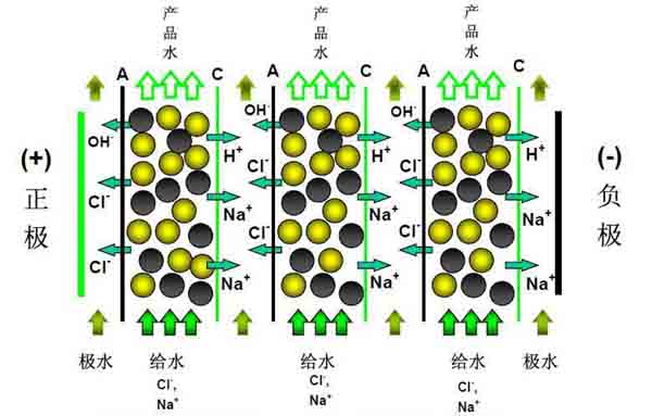 EDI技術簡介 (Electrodeionization)又稱連續(xù)電除鹽技術,它科學地將電滲析技術和離子交換技術融為一體,通過陽、陰離子膜對陽、陰離子的選擇透過作用以及離子交換樹脂對水中離子的交換作用,在電場的作用下實現(xiàn)水中離子的定向遷移,從而達到水的深度凈化除鹽,并通過水電解產生的氫離子和氫氧根離子對裝填樹脂進行連續(xù)再生,因此EDI制水過程不需酸、堿化學藥品再生即可連續(xù)制取高品質超純水,它具有技術先進、結構緊湊、操作簡便的優(yōu)點,可廣泛應用于電力、電子、醫(yī)藥、化工、食品和實驗室領域,是水處理技術的綠色革命。這一新技術可以代替?zhèn)鹘y(tǒng)的離子交換裝置,生產出電阻率高達16-18MΩ·CM的超純水。