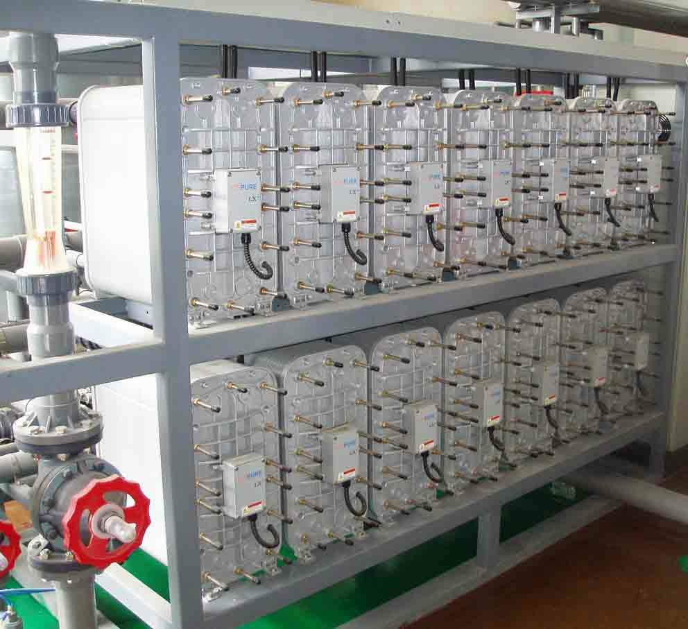 EDI裝置將離子交換樹脂充夾在陰/陽離子交換膜之間形成EDI單元。EDI工作原理如圖所示。 EDI組件中將一定數(shù)量的EDI單元間用網狀物隔開,形成濃水室。又在單元組兩端設置陰/陽電極。在直流電的推動下,通過淡水室水流中的陰陽離子分別穿過陰陽離子交換膜進入到濃水室而在淡水室中去除。而通過濃水室的水將離子帶出系統(tǒng),成為濃水。EDI設備一般以反滲透(RO)純水作為EDI給水。RO純水電阻率一般是40-2μS/cm(25℃)。EDI純水電阻率可以高達18 MΩ.cm(25℃),但是根據(jù)去離子水用途和系統(tǒng)配置設置,EDI純水適用于制備電阻率要求在1-18.2MΩ.cm(25℃)的純水。 高純度水對許多工商業(yè)工程非常重要,比如:半導體制造業(yè)和制藥業(yè)。以前這些工業(yè)用的純凈水是用離子交換獲得的。然而,膜系統(tǒng)和膜處理過程作為預處理過程或離子交換系統(tǒng)的替代品越來越流行。如電除鹽過程(EDI)之類的膜系統(tǒng)可以很干凈地去除礦物質并可以連續(xù)工作。而且,膜處理過程在機械上比離子交換系統(tǒng)簡單得多,并不需要酸、堿再生及廢水中和。EDI處理過程是膜處理過程中增長最快的業(yè)務之一。EDI帶有特殊水槽,水槽里的液流通道中填充了混床離子交換樹脂。EDI主要用于把總固體溶解量(TDS)為1-20mg/L的水源制成8-17兆歐純凈水。 二、EDI模塊結構特點 1、淡水隔板采用衛(wèi)生級PE材料 2、EDI膜片采用進口均相膜和國產異相離子交換膜 3、采用進口EDI專用均粒樹脂和國產EDI專用均粒樹脂 4、EDI電極板采用鈦鍍釕技術 5、壓緊板采用具有硬性的合金鋁軋鑄而成。 6、固定螺絲采用國標標準件 7、膜堆出廠最高試壓7bar不漏水 8、膜堆電阻低、功耗小 9、外觀裝飾板造型美觀結實 10、最大膜堆處理水量3T/H,最小模堆處理水量75L/H 11、純水、濃水、極水通道設計合理,不易堵塞,水流分布均勻、無死角。 三、EDI模塊進水條件