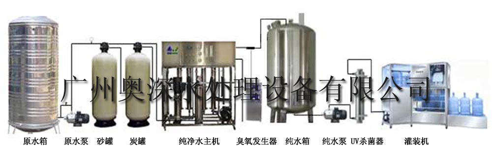 原水箱→原水泵→機械過濾器→活性炭過濾器→軟水器→保安過濾器→超濾裝置→產品水箱→輸送泵→紫外線殺菌器→灌裝線 |